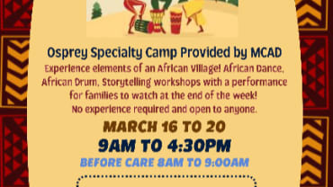 Experience elements of an African Village! African Dance, African Drum, Storytelling workshops with a performance for families to watch at the end of the week!